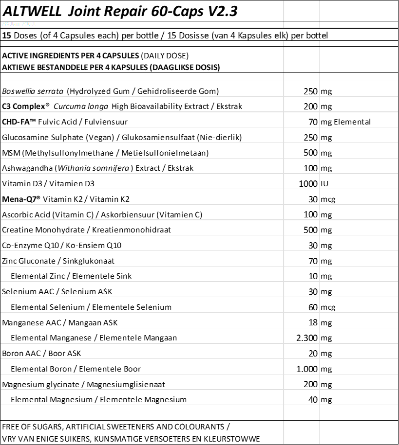 Altwell Joint Repair takes advanced joint support to a new level to reduce daily joint pain, includes strong anti-inflammatory action as well as cartilage and bone fortification.