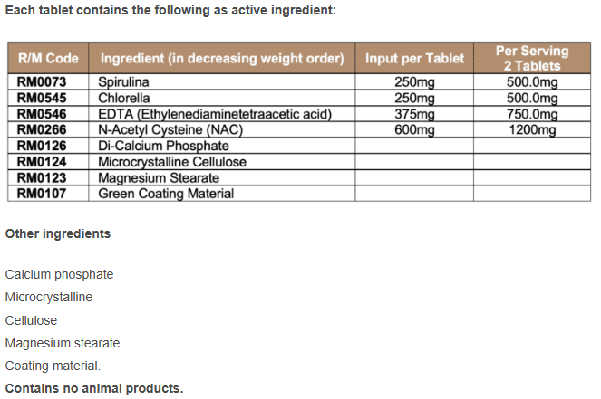 Specially formulated with fermented Chlorella, Spirulina, EDTA and N-Acetyl-Cysteine (NAC). Chlorophyll is a naturally occurring substance. Chlorophyll together with Spirulina help bind environmental toxins. This blend also delivers essential and non-essential amino acids, vitamins, minerals and phytonutrients (anti-oxidants), in their natural state.